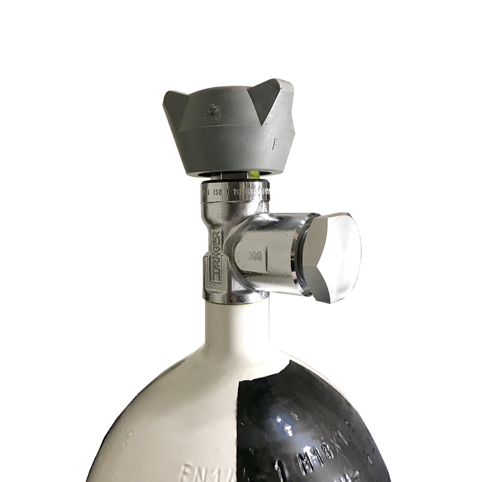 Stalen, naadloze cilinder compleet met uitstroombeveiliging en afsluitmoer.