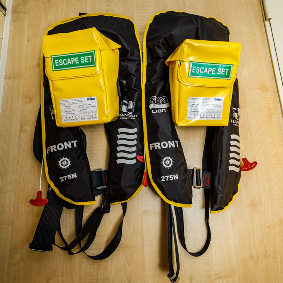 Deze tas met persoonlijke veiligheidsmiddelen kan gebruikt worden in geval van brand tijdens de werkzaamheden. Deze persoonlijke veiligheidstas wordt meestal gebruikt op offshore-platforms.